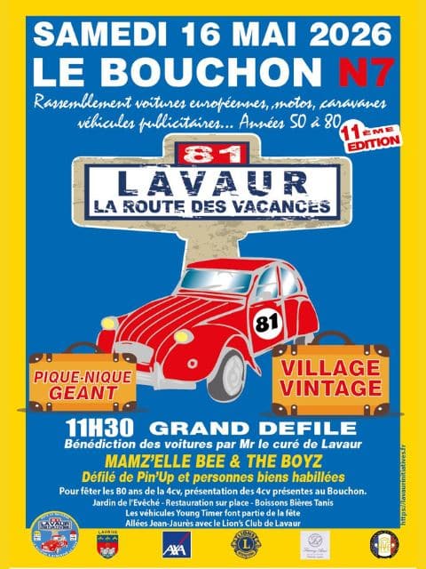Tous les ans, Lavaur accueille le « bouchon ». Il s’agit d’un rassemblement de véhicules anciens type « bouchon de la nationale 7« . Le rassemblement a lieu dans le centre ville et les jardins de l’Evêché, autour de la mairie et de la cathédrale. Les participants (propriétaires et visiteurs) sont invités à venir habillés à la mode des « sixties ».